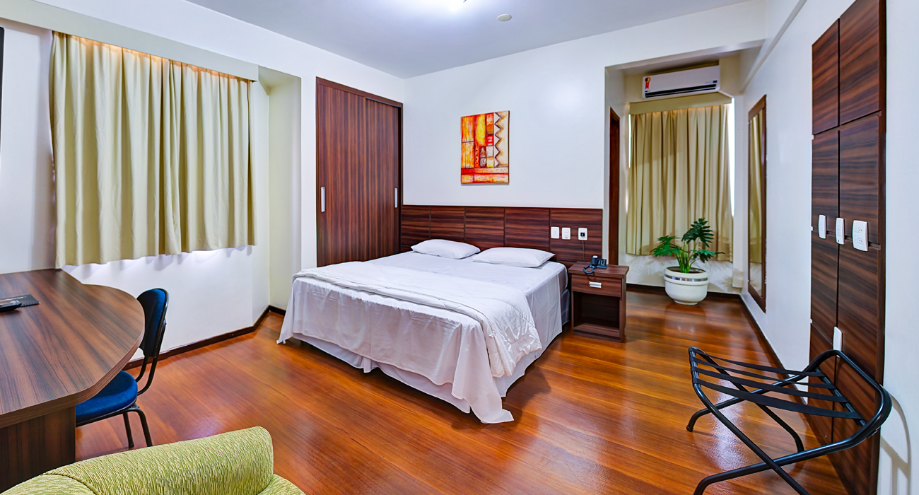 Para essa categoria disponibilizamos cama box com colchão de molas ensacadas visando o conforto dos nossos hóspedes. Nossas camas de casal são KING SIZE.